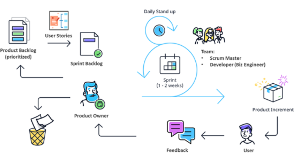 비즈니스와 개발 팀 간의 연락 담당자입니다. PO는 프로젝트 이해 관계자의 기대치를 추적하고 프로젝트 요구 사항을 정의하며 우선 순위를 지정합니다. 또한 제품 소유자는 요구 사항의 비전과 가치를 팀에 전달할 책임이 있습니다. 또한 PO는 사용자 피드백을 관리합니다. 이러한 피드백과 비즈니스 요구 사항을 기반으로 PO는 지속적으로 우선 순위를 조정합니다.