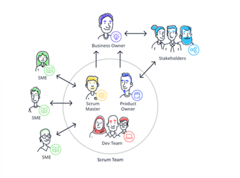 SME는 팀이 UX/UI, QA, 테스트 및 통합과 같은 주제에 대한 자세한 지식을 요구할 때 참여합니다. SME는 일반적으로 여러 스크럼 팀에 참여하므로 각 특정 스크럼 팀에서 제공해야 하는 제품에 대해 최종 책임을 지지 않습니다. 이것은 제품 제공을 책임지는 핵심 팀입니다.