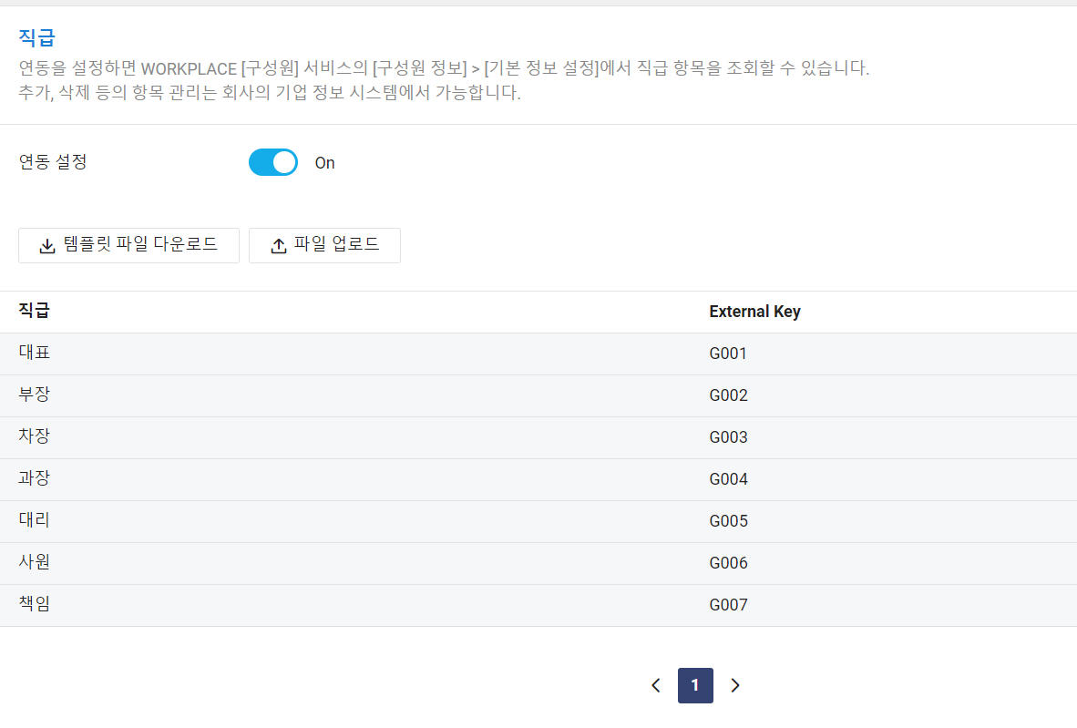 템플릿 파일을 다운받은 후 external key를 입력한뒤 파일을 다시 업로드한다. 직급의 컬럼을 바꾸고 싶으면 admin계정으로 워크플레이스에서 진행해야 하며, 임의로 템플릿을 바꿔도 업로드는 되지 않는다.